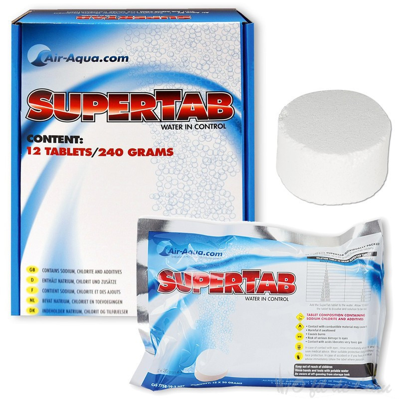 SuperTab se compose d'un mélange de chlorite de sodium et d'additifs. Lorsqu'un comprimé est ajouté à l'eau, du dioxyde de chlore (ClO₂) se forme. Le dioxyde de chlore ne doit pas être confondu avec le chlore !
