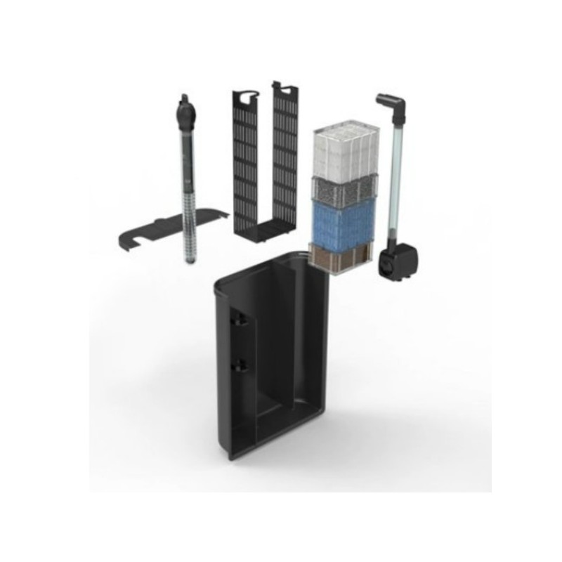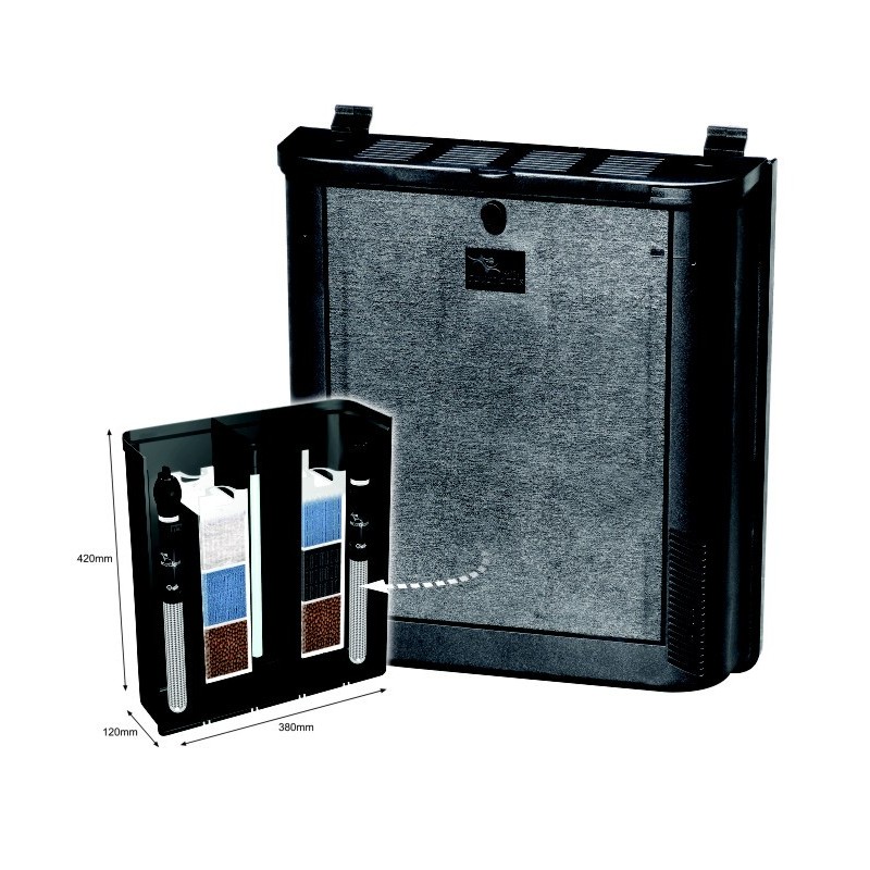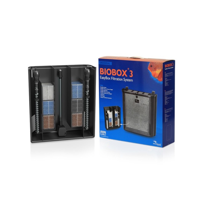 BIOBOX 3 est un filtre à décantation fermé sur l'arrière. il est livré avec mousse bleue gros grain et grain moyen, mousse charbon,ouate et support bactérien. Ventouses et clips de maintien sur le rebord de l'aquarium sont fournis. Peut être collé grâce à de la colle siliconne.