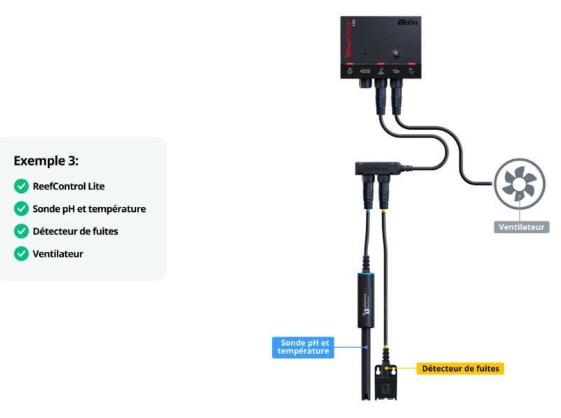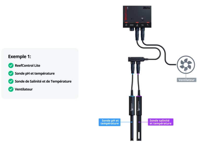 Les mesures de pH et de température peuvent être utilisées individuellement pour contrôler automatiquement les équipements DC tels que les électrovannes ou les ventilateurs de refroidissement, ou les équipements AC tels que les chauffages quand ils sont combinés avec le ReefControl Power.