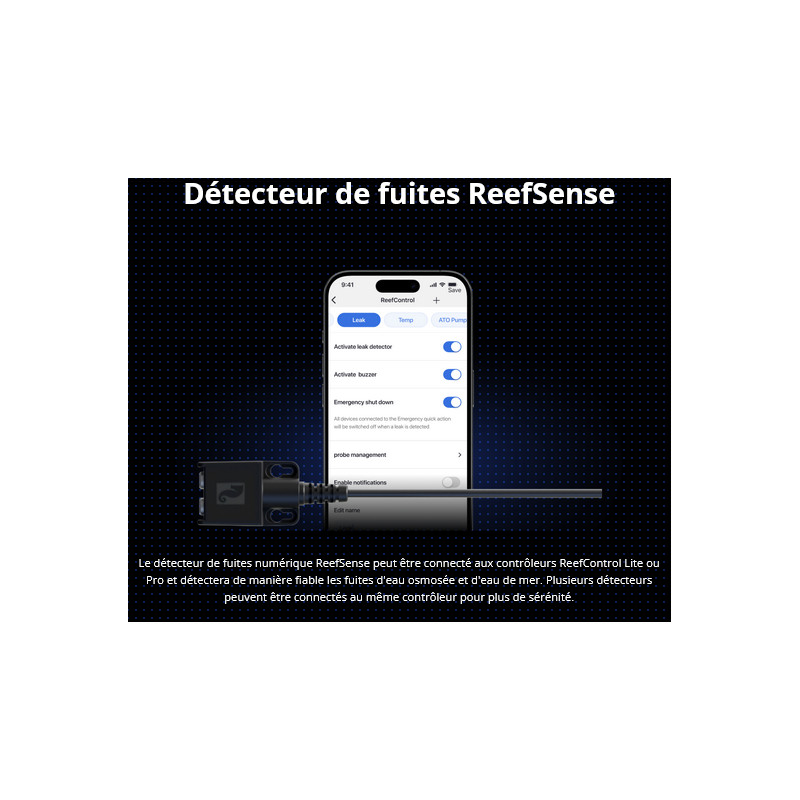 Compatible avec les contrôleurs Red Sea ReefControl Lite, ReefControl Pro et ReefControl Pro Deluxe, le détecteur de fuite ReefSense s’intègre parfaitement à l’écosystème connecté ReefBeat. Dès qu’une fuite est détectée, une alerte instantanée est envoyée via l’application ReefBeat, permettant une intervention rapide afin de limiter les dégâts.