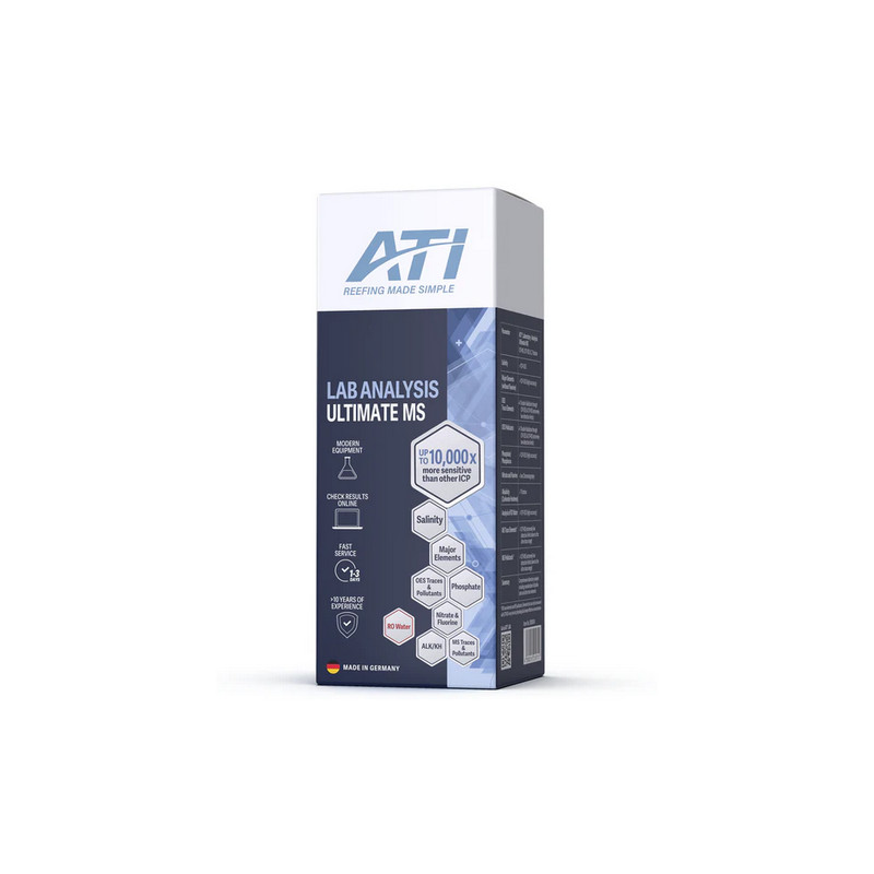 L'analyse de base de l'eau ATI ICP-OES est une analyse de laboratoire de 40 à 50 paramètres* de l'eau d'un aquarium récifal (*selon version). Elle offre un aperçu complet de la santé de l'aquarium, ce qui est impossible avec les équipements de test traditionnels.