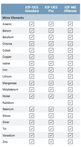 Test des éléments mineurs : aluminium, antimoine, arsenic, baryum, béryllium, bismuth, cadmium, chrome, cobalt, cuivre, fer, iode, plomb, lanthane, lithium, manganèse, mercure, molybdène, nickel, phosphore, sélénium, silicium, argent, thallium , étain, titane, tungstène, vanadium et zinc