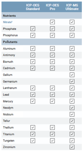 Teste de 40 à 50 paramètres de l'eau, dont le calcium, le magnésium, le potassium, le fer, le strontium et l'iode, ainsi que les métaux lourds comme le cuivre et le plomb, permettant d'identifier les plus infimes écarts.