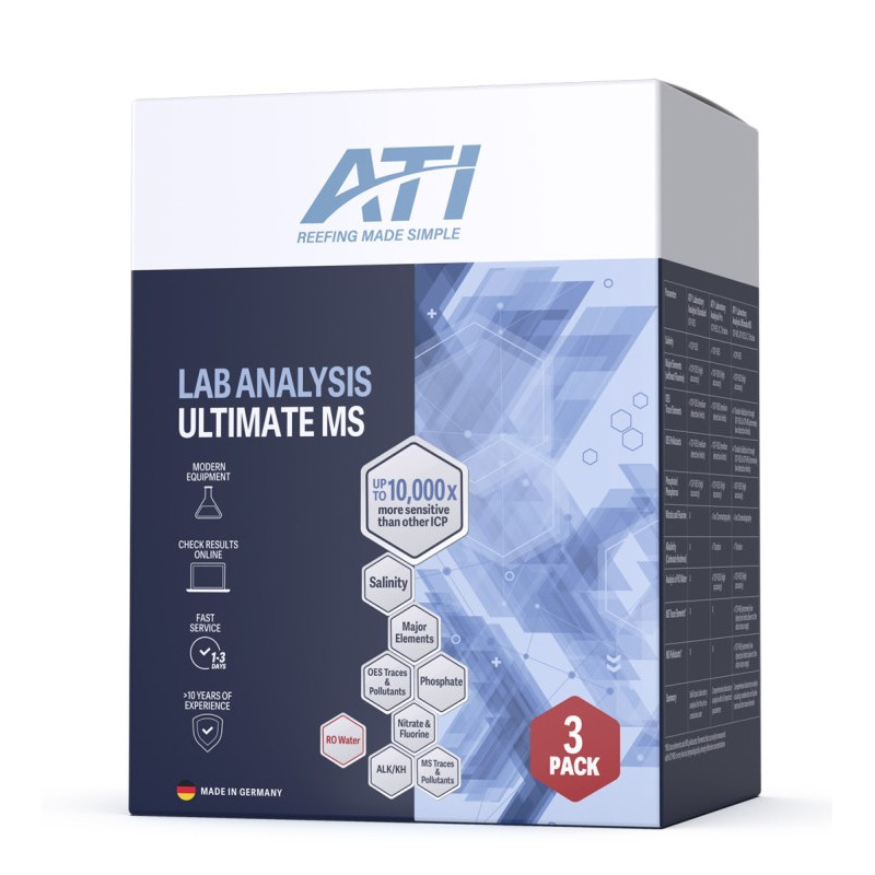 L'analyse de base de l'eau ATI ICP-OES est une analyse de laboratoire de 40 à 50 paramètres* de l'eau d'un aquarium récifal (*selon version). Elle offre un aperçu complet de la santé de l'aquarium, ce qui est impossible avec les équipements de test traditionnels.